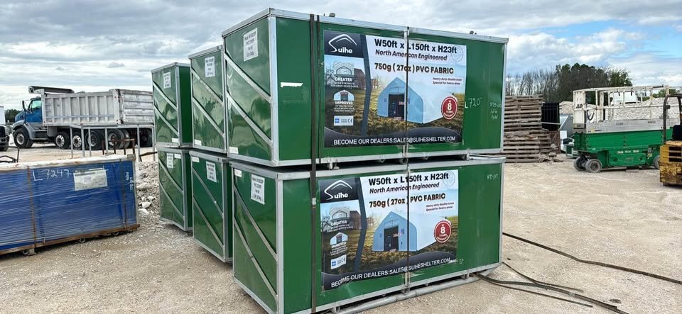 New 150 feet long 50 feet wide 23 foot tall 27 ounce fabric (very thick ) Dual truss 6 crates total Other sizes available 70×30 dual truss $6500.00- 2 crates 80×40 dual truss $8500.00- 2 crates 60×40 dual truss $6500.00- 2 crates 30×65 single truss $3000.00 single crate