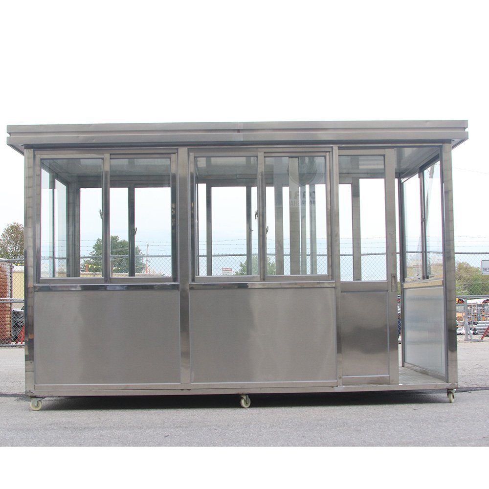 Our 6.5 x 12 stainless steel guard shacks are simply top of the line. Built from stainless steel wrapped insulated panels, they have 2” thick insulation on the walls and 6” of insulation on the roof. With a welded and bolted construction, these guard shacks are meant to last. Stainless steel hinges on swing door models, and tracked stainless steel sliding doors on other models, we are sure to have what you need. All stainless steel guard shacks feature 360° visibility, sliding stainless steel locking windows on 3 sides and fixed windows on the door side, as well as welded on heavy duty double locking casters on the base for easy portability. The stainless steel guard shacks have a welded base of 2”x 2” square tube with a heavy duty galvanized tread plate floor welded on top. The swing door models come with a high security locking door lever lock, as well as a welded on stainless steel hasp for padlock use. The sliding door models feature a high security hook lock and also a welded on stainless steel hasp for padlock. Our stainless guard shacks are a heavier weight than our economy models – strong enough to not be blown away under most circumstances, but still light enough to be moved around your facility should the need arise. Add the optional HVAC/and electric package and bring your employees some comfort all year round.